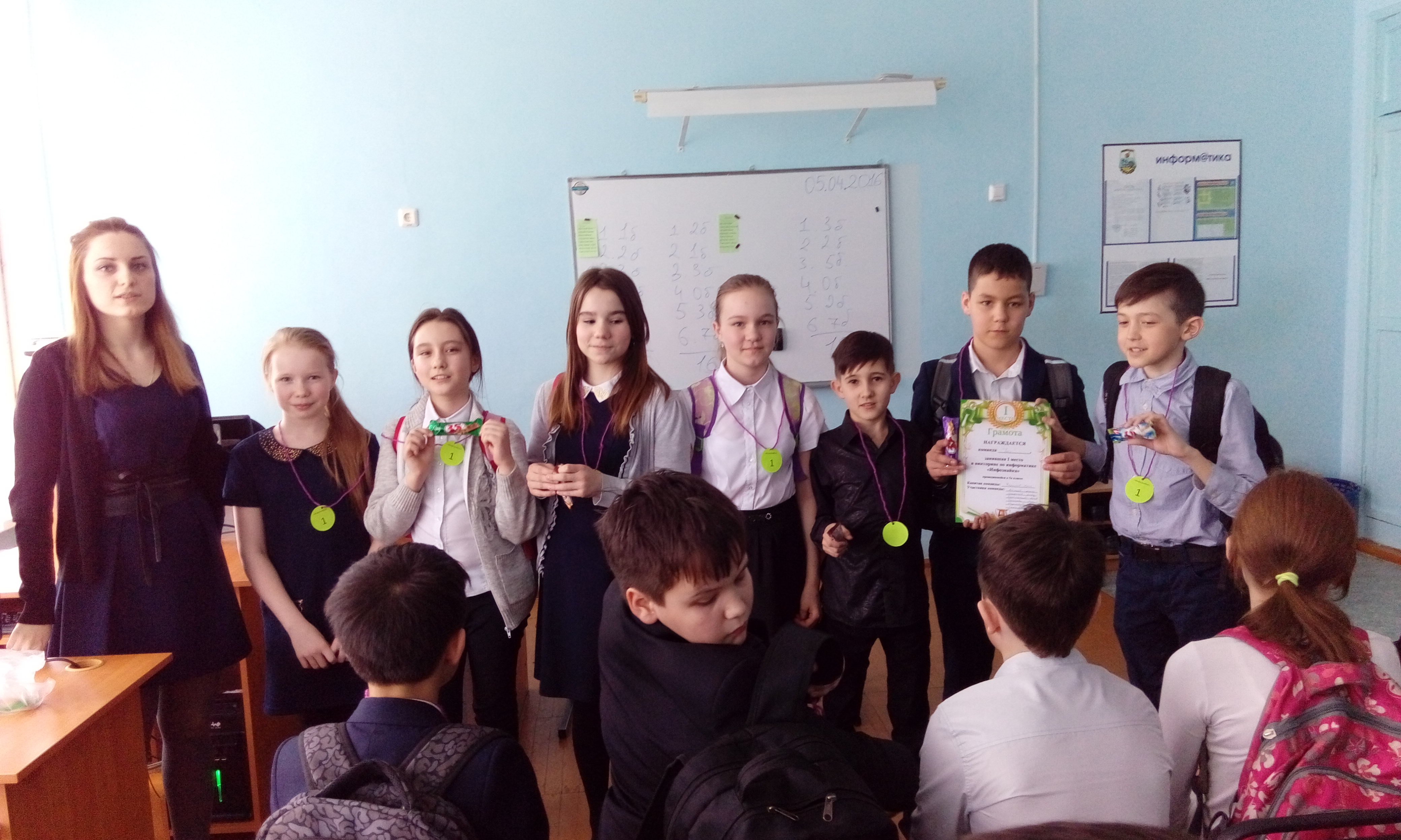 5 апреля 2016 г. в 5а классе на классном часу Власовой Викторией Павловной была проведена викторина "Инфознайка". Викторина включала в себя как игровые так и интеллектуальные конкурсы. Ребята угадывали устройства компьютера, определяли самого сильного капитана, писали забавные истории, отвечали на вопросы. В начале мероприятия все ребята были распределены на 3 команды. По завершению конкурсов были определены места, ребята получили сладкие призы. Команду, занявшую первое место, наградили грамотой (размещена на классном уголке), на которой отмечены капитан и участники команды.
